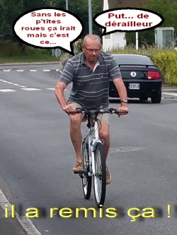 Certains trouvent qu'à la marche c'est dur de voir son ventre arriver avant ses pieds , alors ils ont fait un régime SPECIAL PAIN, QUE DU PAIN à tous les repas, sans beurre et sans pâté dessus.... mais à force d'acheter des bannettes et des pains de six livres, il y a un chanceux qui a gagné un vélo !!!! (Voir photo) A noter que les copains de la section cyclo lui ont enlevé les petites roues stabilisatrices, mais l'apprentissage des vitesses à la poignée est difficile ! Par contre au niveau du style, rien à dire, on voit moins les abdominaux qu'a la marche !!!!! ''