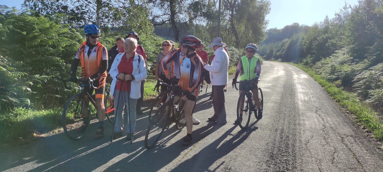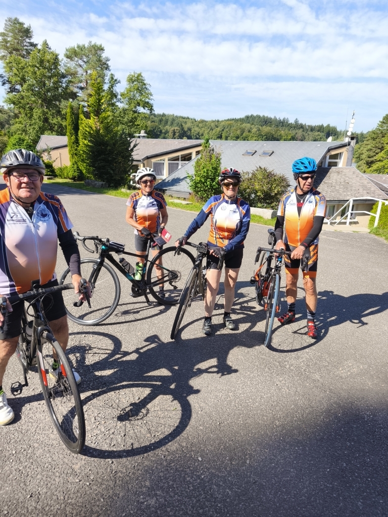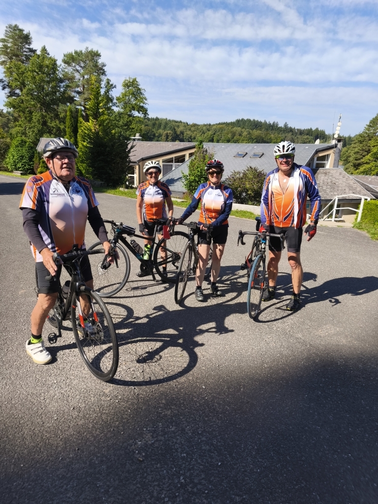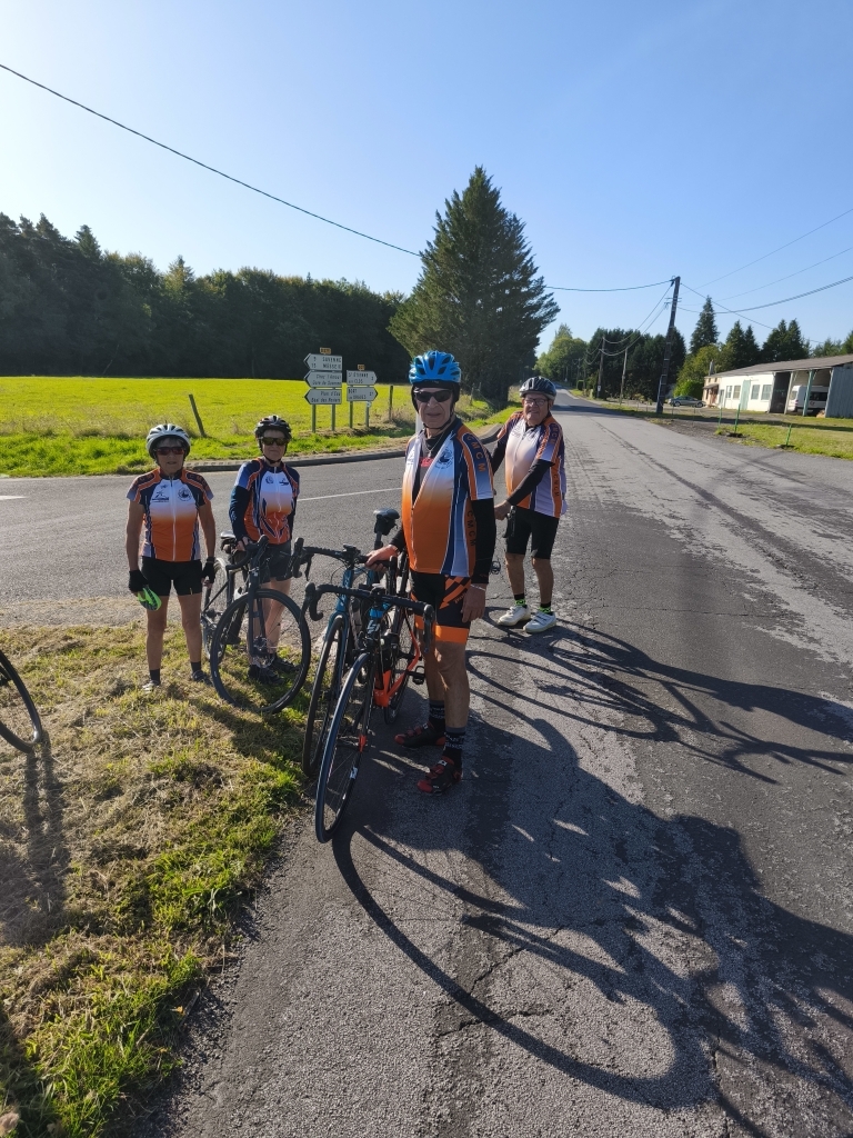 Départ à 8h45 pour 4 cyclos Christiane M – Béatrice G – Jean-Pierre G et Claude H : le temps est menaçant, frais, mais pas d'eau, le circuit aujourd'hui est de remonter à La Courtine avec un dénivelé de 550 m, mais les descentes sont moins dangereuses que la veille. A la hauteur de Courteix, sur une sortie de chemin, rencontre du groupe B de nos marcheuses et marcheurs, petites photos et ça repart direction la Courtine ville du retour et reprendre Eygurande pour rentrer au VVF, les 2 cyclottes et les 2 cyclos sont très heureux et très satisfaits de leur 2ème étape.