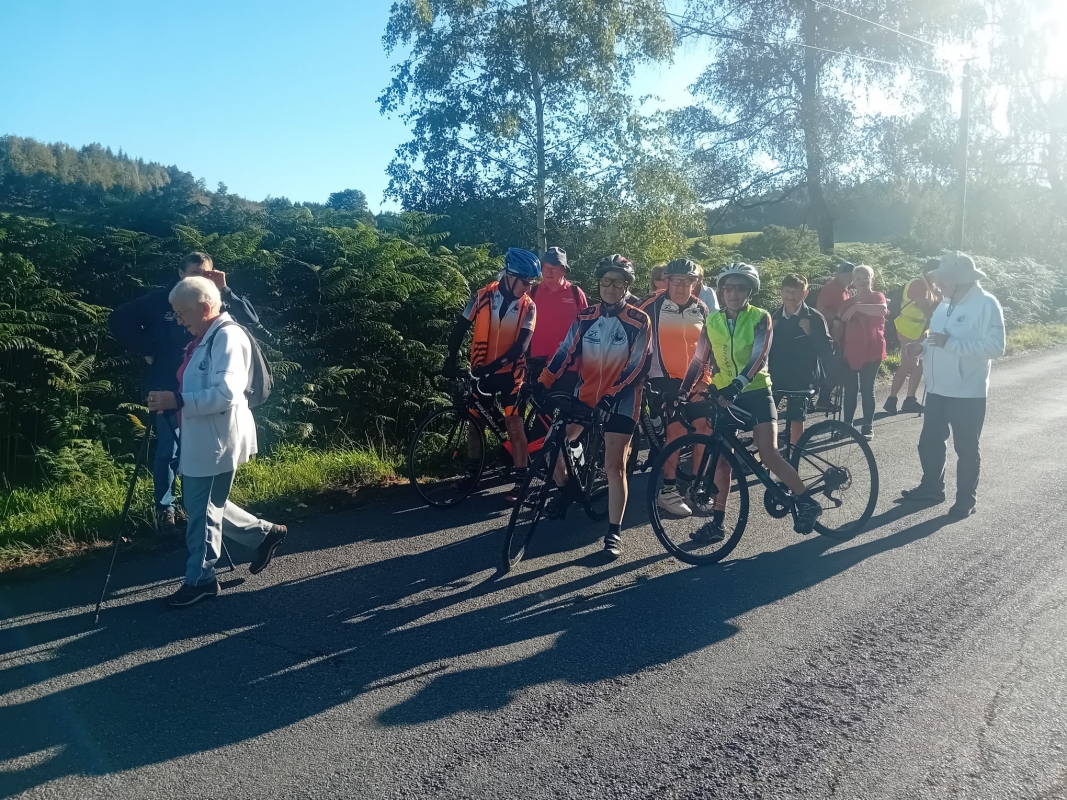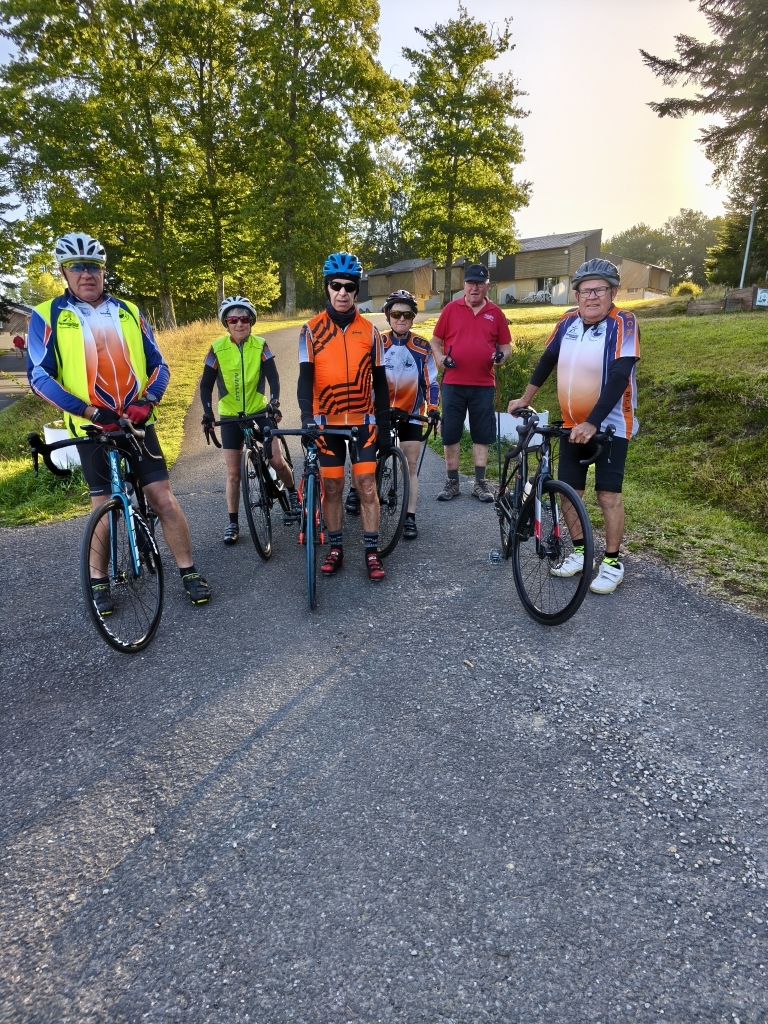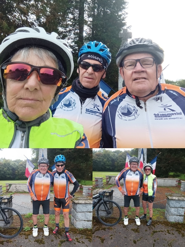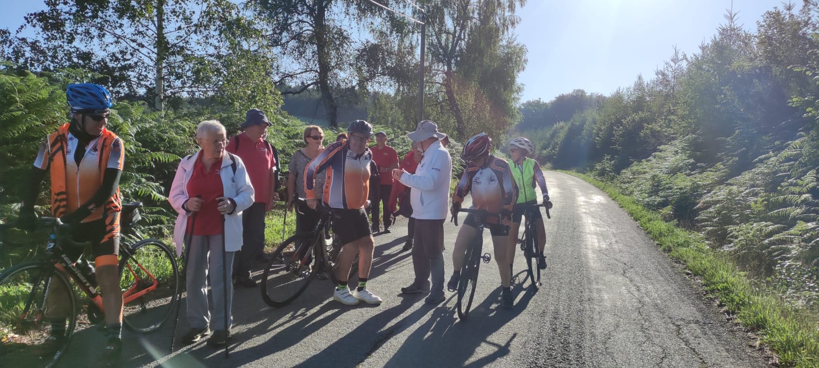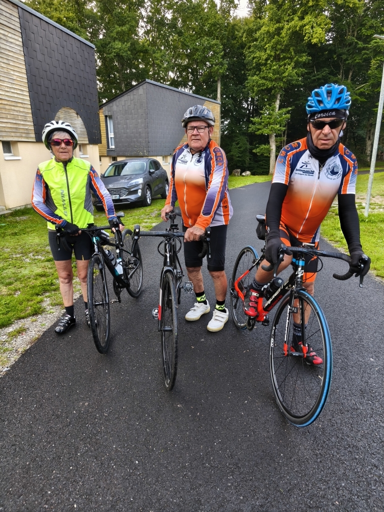 Départ à 8h45 pour 4 cyclos Christiane M – Béatrice G – Jean-Pierre G et Claude H : le temps est menaçant, frais, mais pas d'eau, le circuit aujourd'hui est de remonter à La Courtine avec un dénivelé de 550 m, mais les descentes sont moins dangereuses que la veille. A la hauteur de Courteix, sur une sortie de chemin, rencontre du groupe B de nos marcheuses et marcheurs, petites photos et ça repart direction la Courtine ville du retour et reprendre Eygurande pour rentrer au VVF, les 2 cyclottes et les 2 cyclos sont très heureux et très satisfaits de leur 2ème étape.