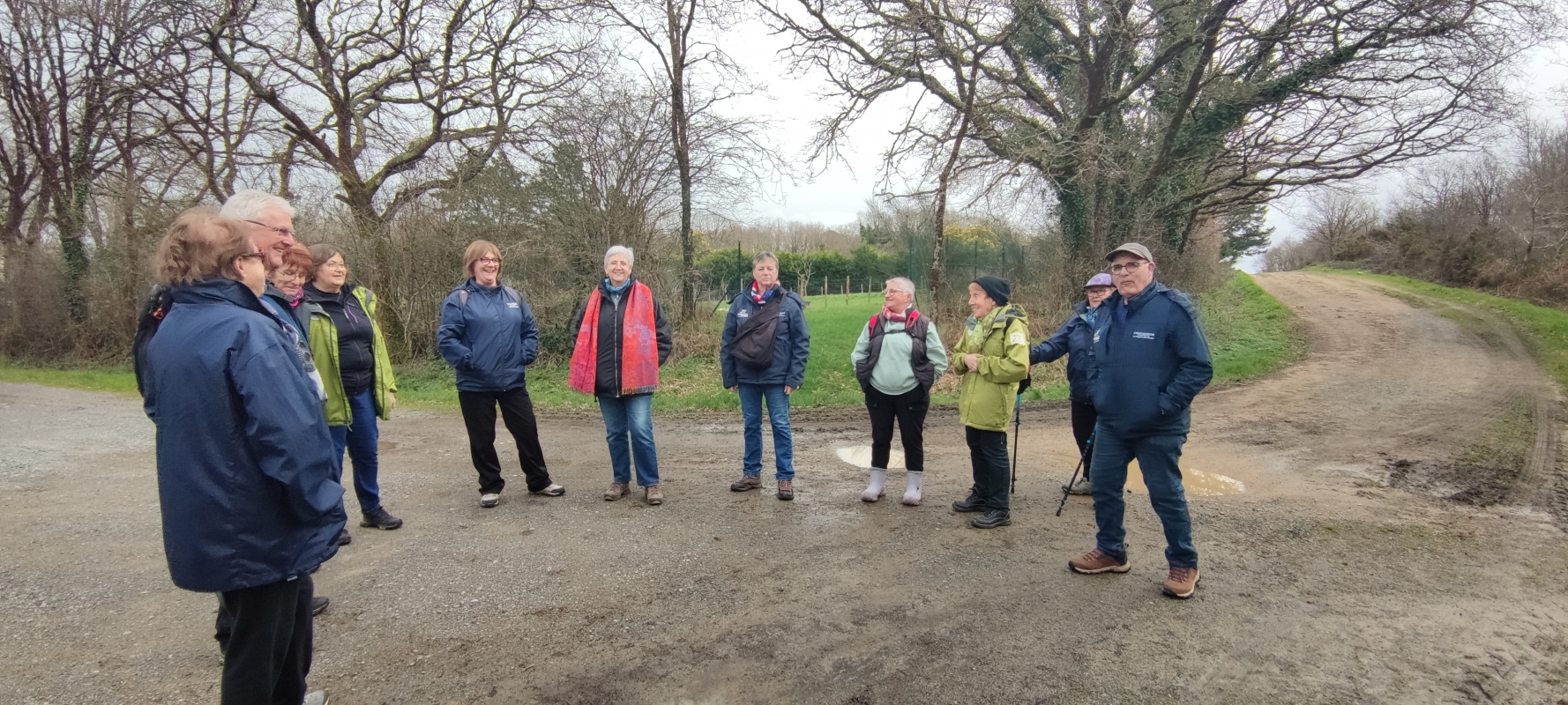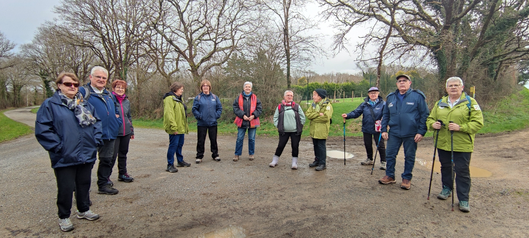 12 marcheurs pour faire le circuit de Ste Reine de Bretagne : Christian D, Christian L, Françoise L, Jocelyne, Margaret, Michelle, Marie-Rose, Brigitte G, Bernadette G, Monique M, Anne-Marie et Evelyne.